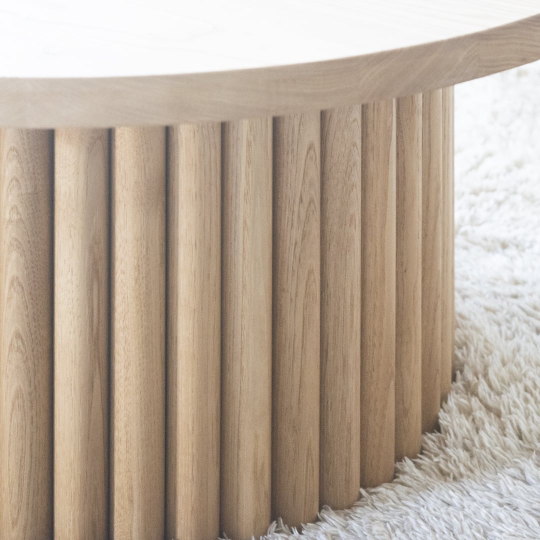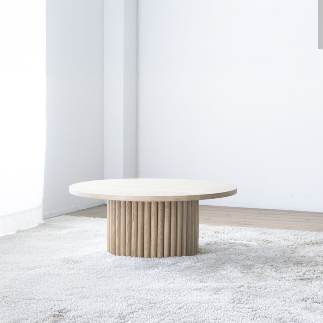 自然の豊かさとモダンデザインが調和した、国産栗無垢材を贅沢に使用したリビングテーブル。温かみのある木目と、円柱状のリブ(縦格子)を組み合わせた脚部のデザインが、空間に存在感と上質なアクセントを与えます。